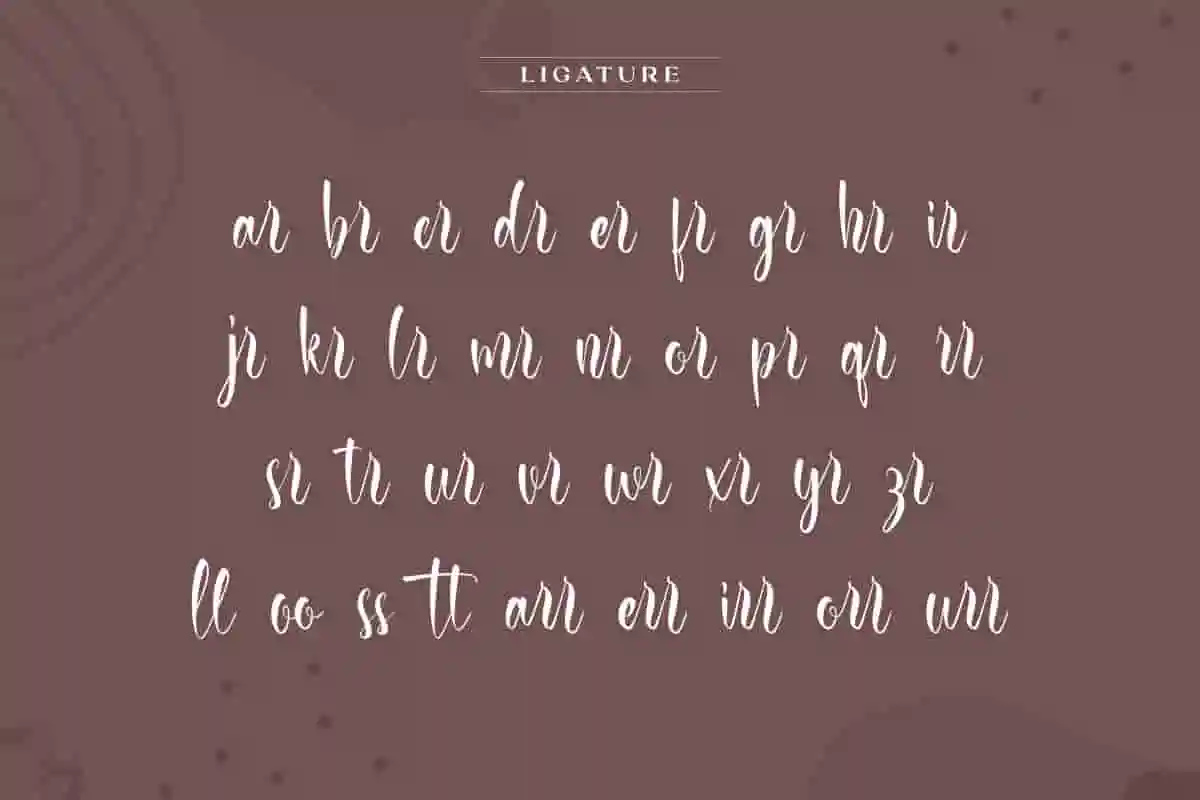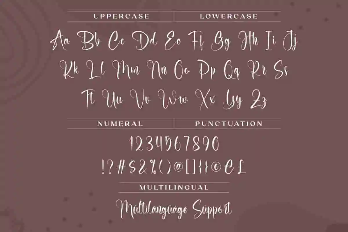 Charisna Font includes full set of Uppercase and Lowercase Basic Characters, Numerals and Punctuation. Also it contains alternate and ligature characters to add aesthetics to every design created such as brand logo, business card, custom design, invitation, label, product packaging, quote, title, web page, etc.