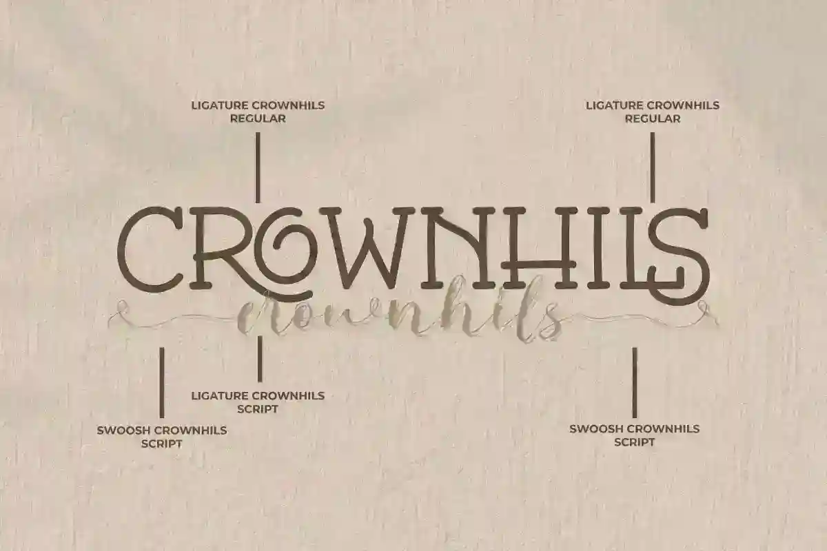 Crownhils Font includes full set of Uppercase and Lowercase Basic Characters, Numerals and Punctuation. Also it contains ligature characters and swoosh to make your designs have an awesome look and perfect for many projects such as billboard, blog headers, business card, label, magazine display, mockup design, product packaging, quote, title, tote bag custom, and more.