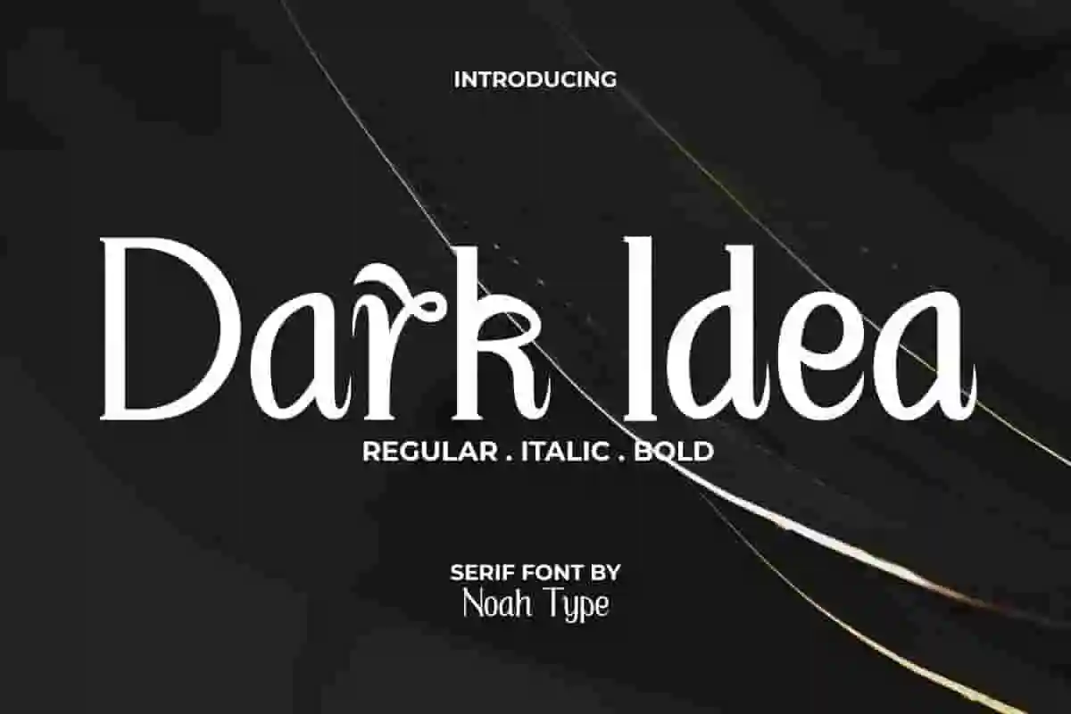 Dark Idea Font is a unique unusual display font made by Noah Type Std. This font is made into three different styles, there are Regular, Italic, and Bold, that will make your designs more interesting! It would be perfect choice for many industries, such as accessories, advertisement, café, fashion, florist, furniture, handicrafts, perfume, printing, publishing, real estate, restaurant, and more!