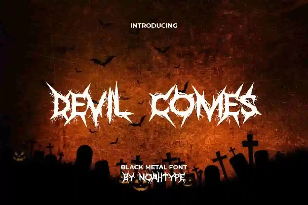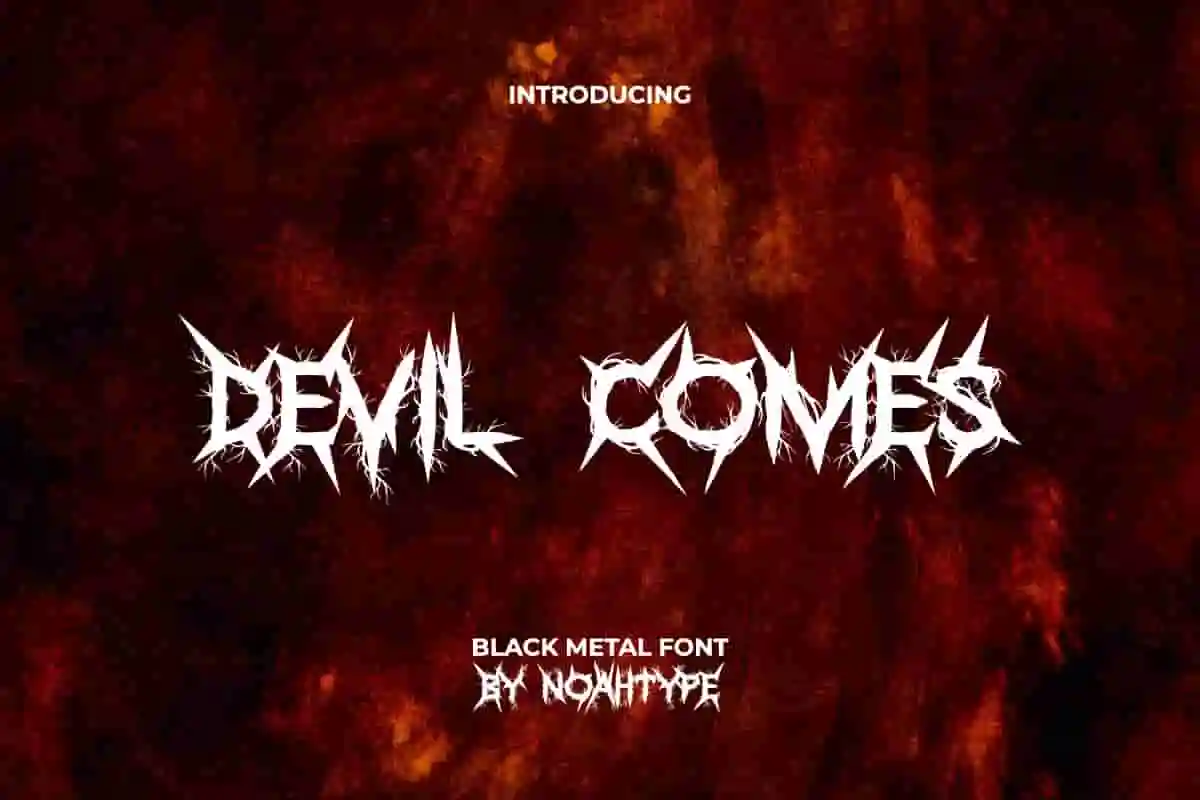 Devil Comes Font is a horror black metal font created by NoahType. This font has thorns and roots around the letters so it looks impressive and scary at the same time. It will be perfect for any designs, such as brand image, custom design, invitation, label, marketing material, menu, poster, printing, product packaging, quotes, signage, website, and many more!