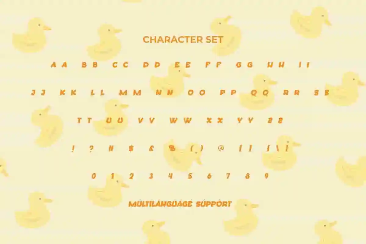Duck Sound Font includes full set of ALL CAPS for Uppercase and Lowercase Basic Characters, Numerals, Punctuation, and Symbol. The characters of this font will give cute feels and also a perfect choice for many industries, such as accessories, advertising, cartoon, comic, event or festival, fashion, game, kids stuff, printing, publishing, etc.