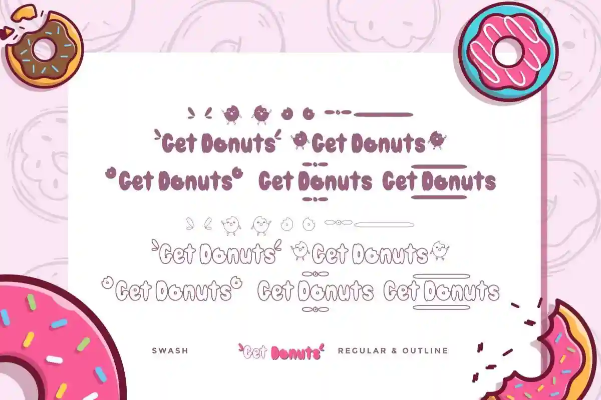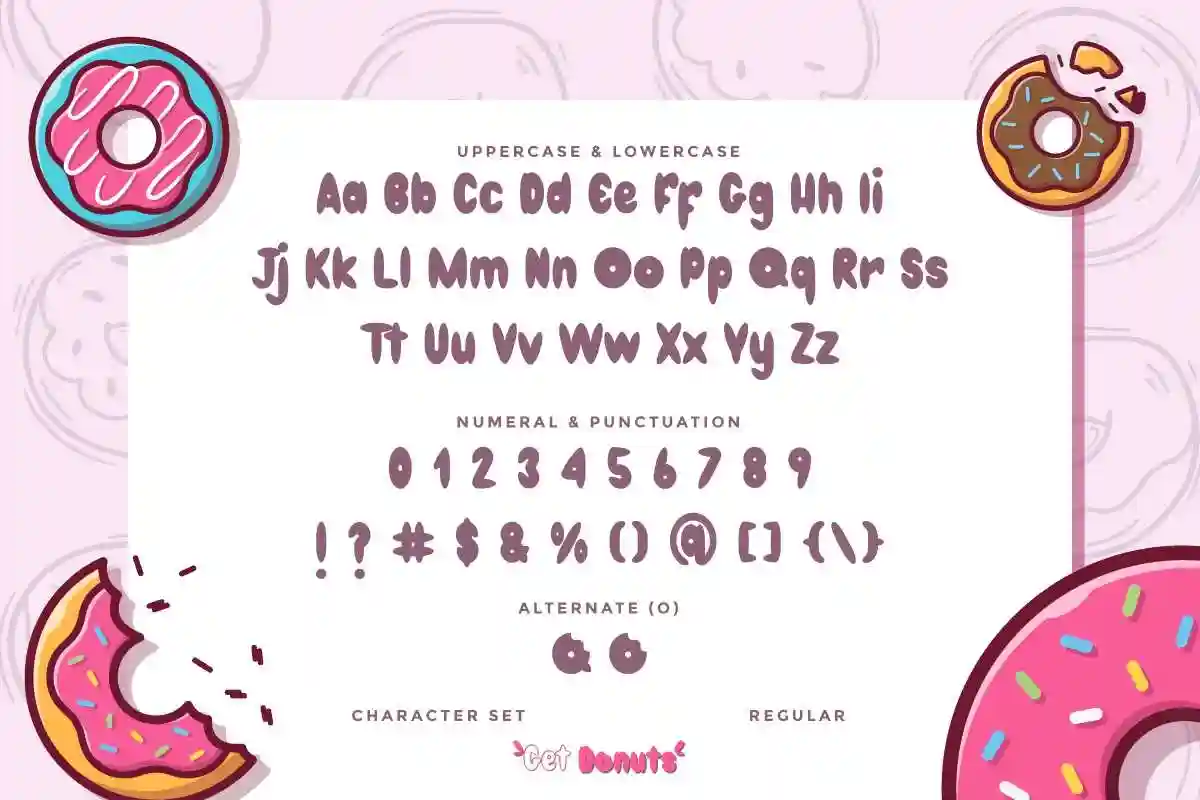 Get Donuts Font supports multilingual languages (including multiple currency symbols). With a simple installation, Get Donuts will be ready to use both on Windows machine or Mac. In order to use alternative characters, usually we just need to block the end letters and select alternative letters on glyphs option. It really common in almost any software (Character Map for Windows and Font Book for Mac.). It work well on Adobe software such as Illustrator, Photoshop and several other software.