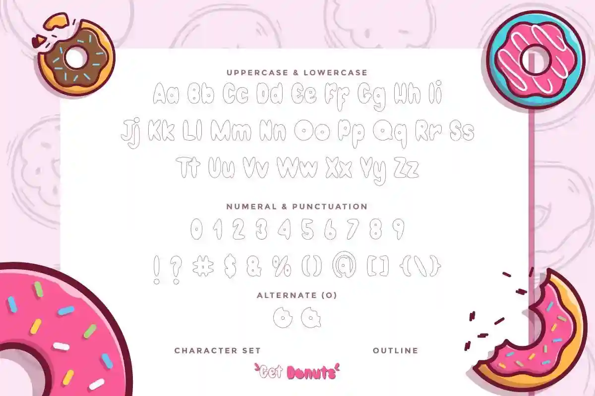 Get Donuts Font includes two styles : Regular and Outline. The fonts come with full set of Uppercase and Lowercase Basic Characters, Numerals and Punctuation. Also it contains some alternates characters to perfectly make natural handwriting look that add more aesthetic fonts to perfect your extraordinary project. Get Donuts Font will be awesome for comic, invitations, events, movie, donut, food, menu, restaurant, café, children book, school, kids products, social media etc