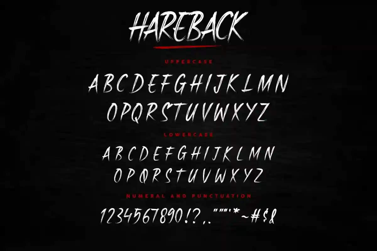 Hareback Font includes full set of Uppercase and Lowercase Basic Characters, Numerals and Punctuation. Also it contains ligatures and a lot of stylistic alternates characters to perfectly make awesome look that add more aesthetic fonts to perfect your extraordinary project.