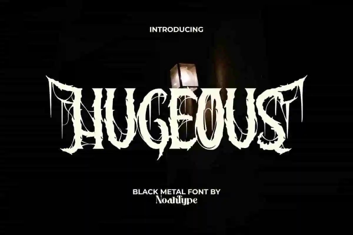 Hugeous Font is an odd horror black metal font. This font has a sharp line and edge with the addition of fine lines that resemble spider webs. It will be perfect for any designs, such as brand image, cover, custom design, invitation, label, marketing material, menu, poster, product packaging, quotes, signage, web, and many more!