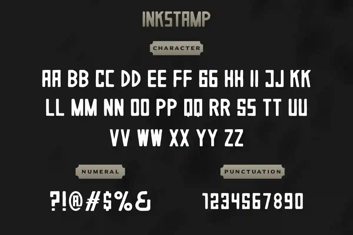 Inkstamp Font have vintage and olf style but you can always explore and use it for any of your projects. The font is ready to use both on Windows machine or Mac. It work well on Adobe software such as Illustrator, Photoshop and several other software.