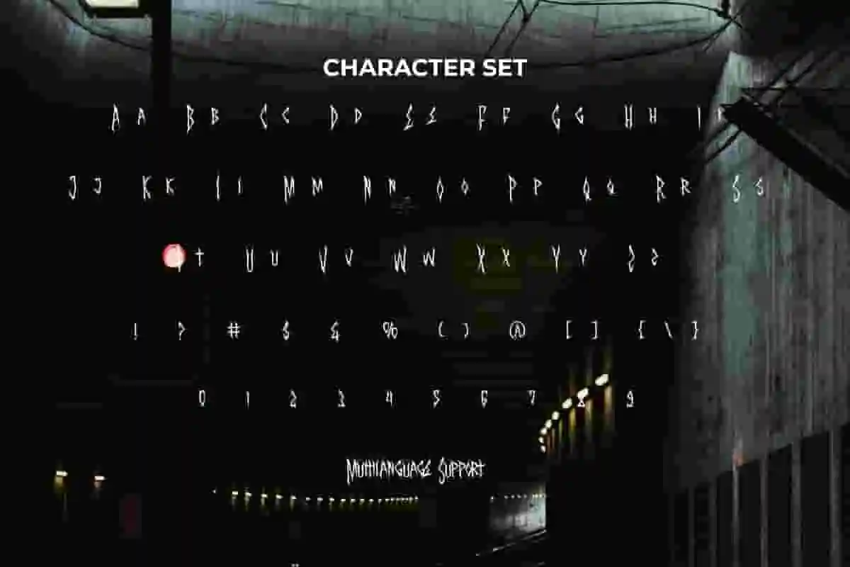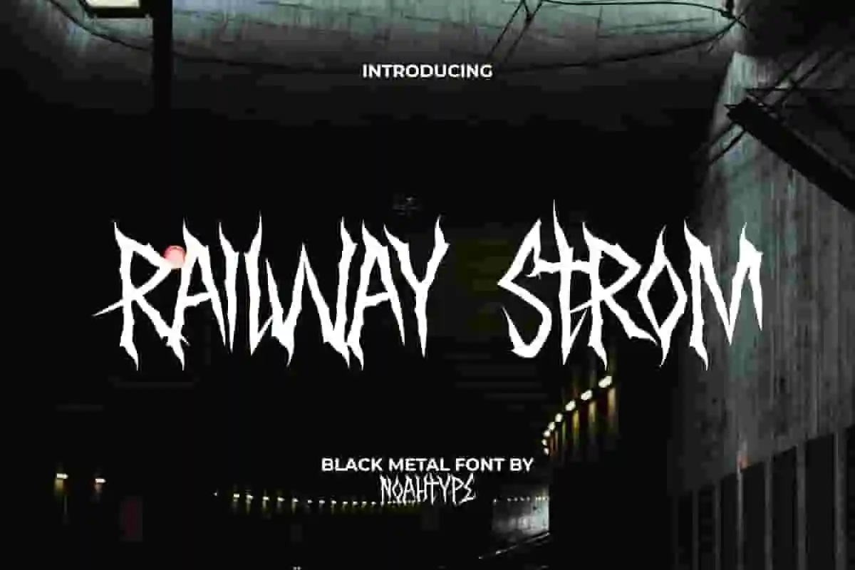 Railway Strom Font is a hardcore sketched rough spooky and sharp black metal font by NoahType. Its shape resembles a sharp and thorny tree branch, making it look scary and mysterious. It will be perfect for any designs, such as custom design, brand image, poster, label, invitation, cover, marketing material, menu, printing, product packaging, quotes, signage, website, and many more!