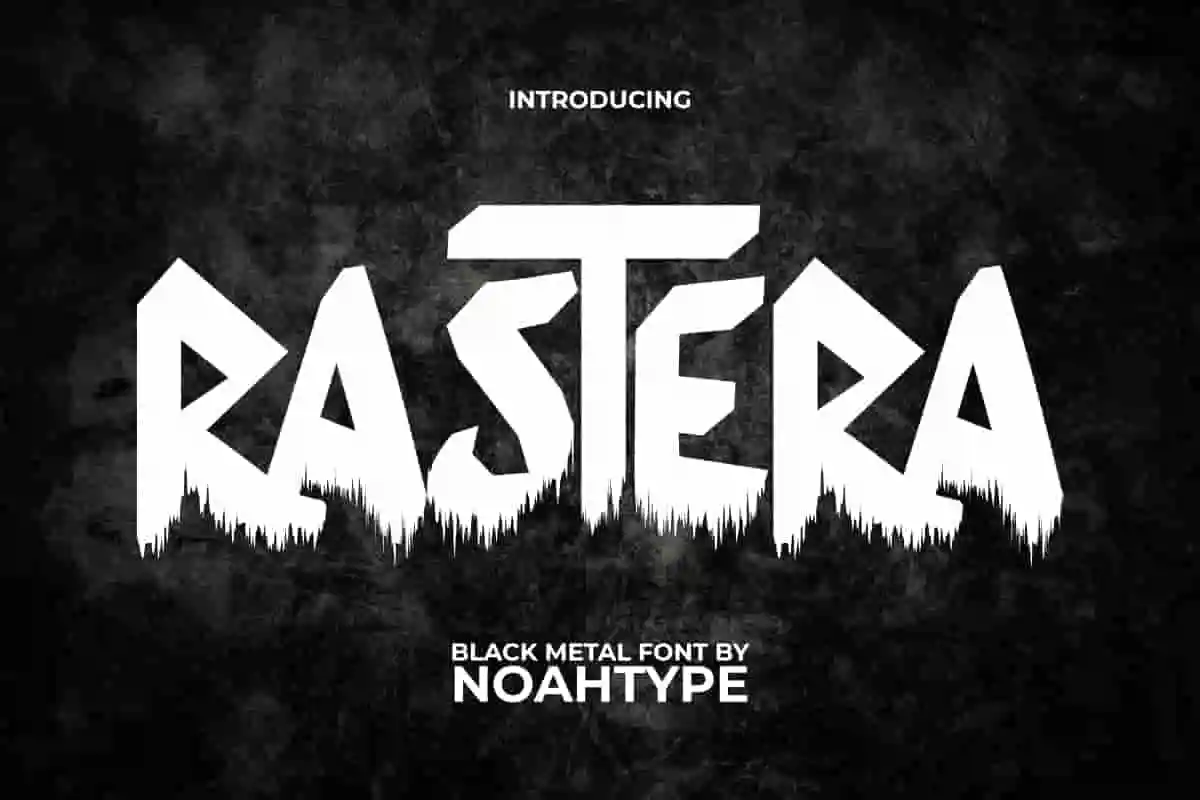 Rastera Font is a punk black metal font with a creepy frost elements by NoahType. This font has a character with a bold and horror charm at the same time because there are drops under the letters. It will be perfect for any designs, such as custom design, brand image, cover, invitation, label, marketing material, menu, poster, printing, product packaging, quotes, signage, website, and many more!