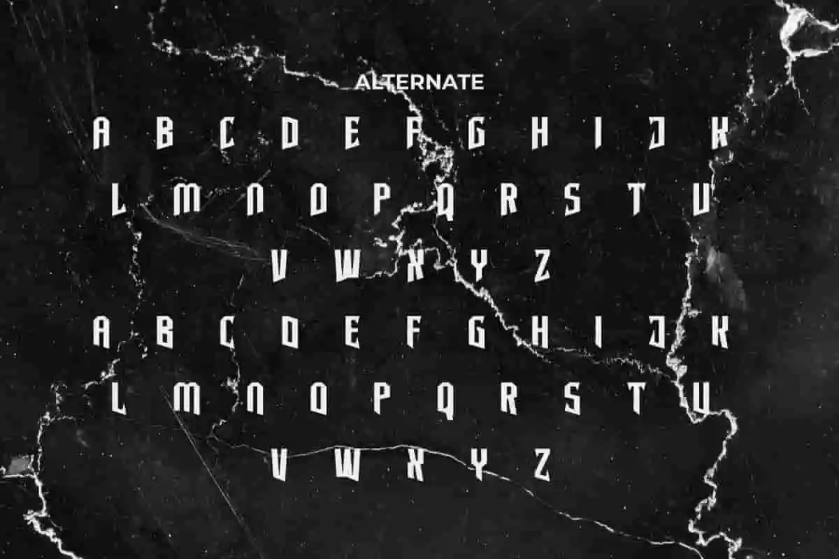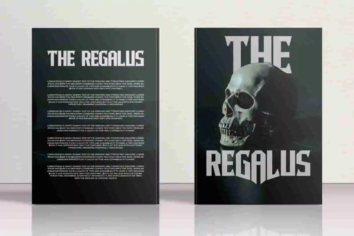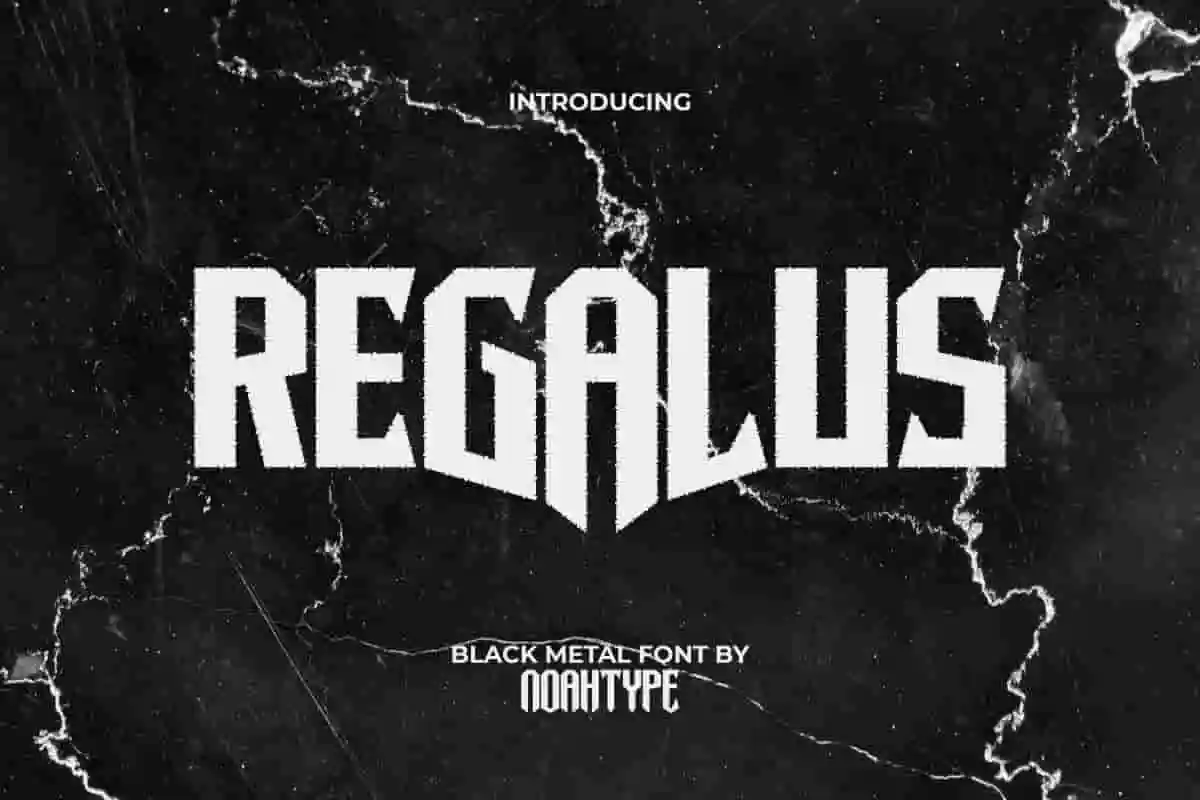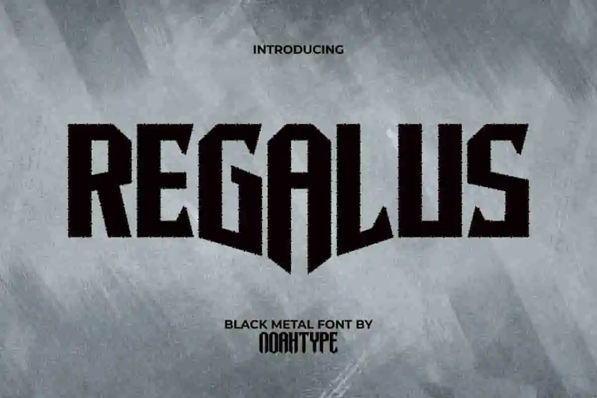 Regalus Font is a bold and sharp black metal font, created by NoahType. Each side of each letter has a rough texture, leaving a slight creepy impression. It will be perfect for any designs, such as brand image, custom design, invitation, label, marketing material, menu, poster, printing, product packaging, quotes, signage, website, and many more!