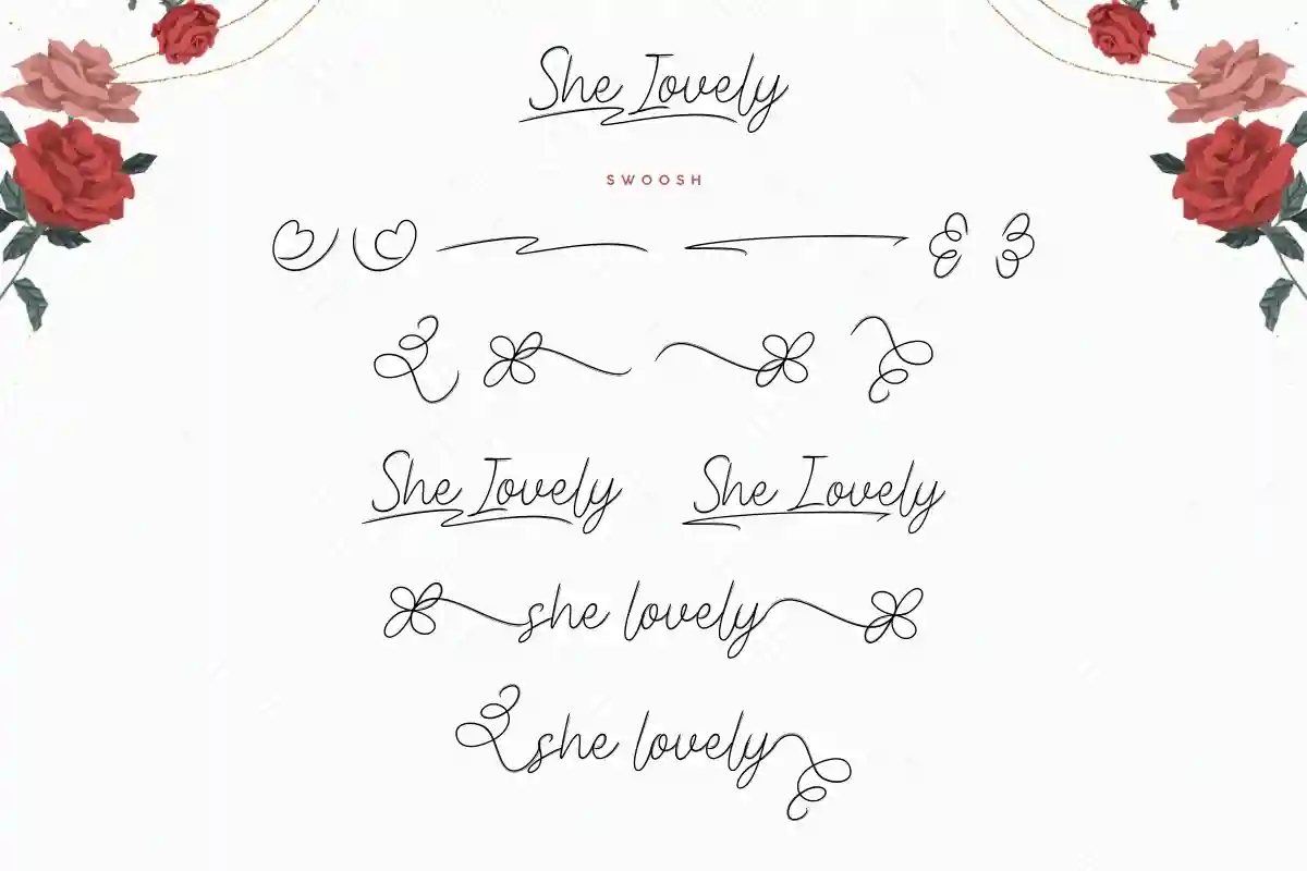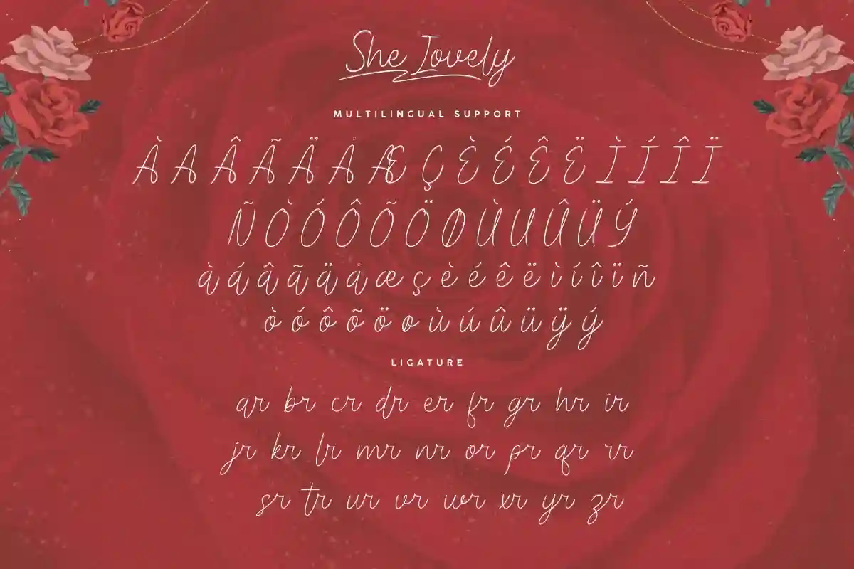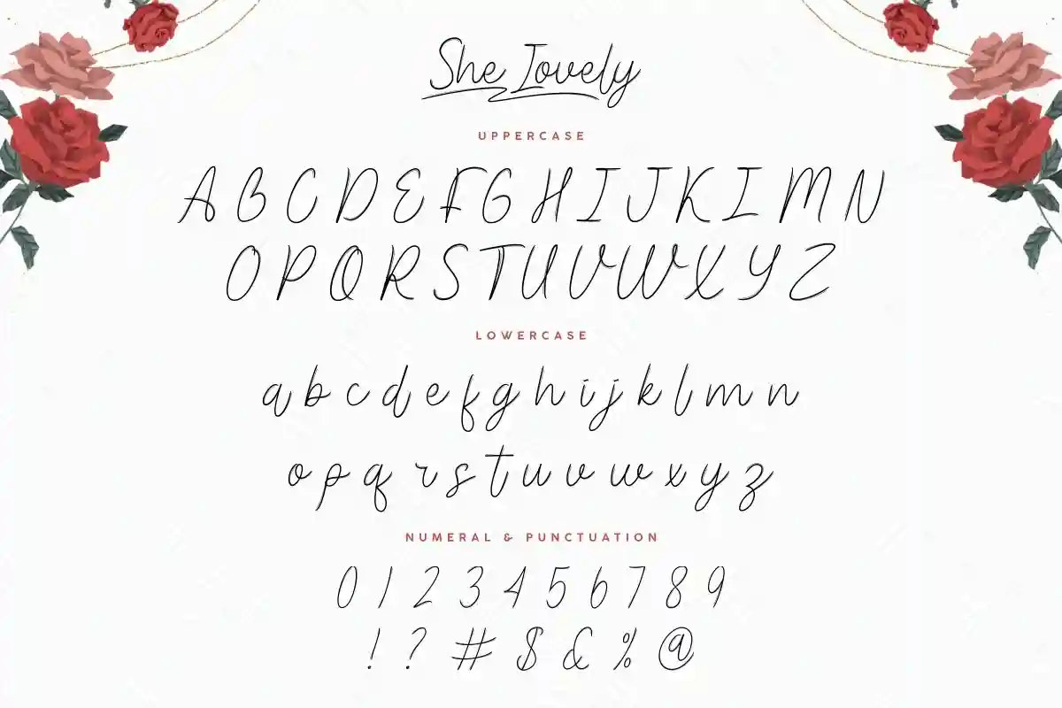 She Lovely handwriting Font includes includes full set of Uppercase and Lowercase Basic Characters, Numerals and Punctuation. Also it contains ligatures and alternates characters to perfectly make natural handwriting look that add more beautiful and aesthetic fonts to perfect your extraordinary project. She Lovely will be awesome for wedding, engagement, branding, invitations, florist, hair stylish, makeup artist, event organizer, movie, music, festival, promotions, social media etc