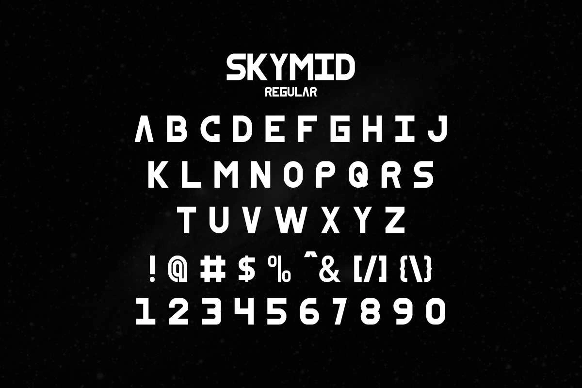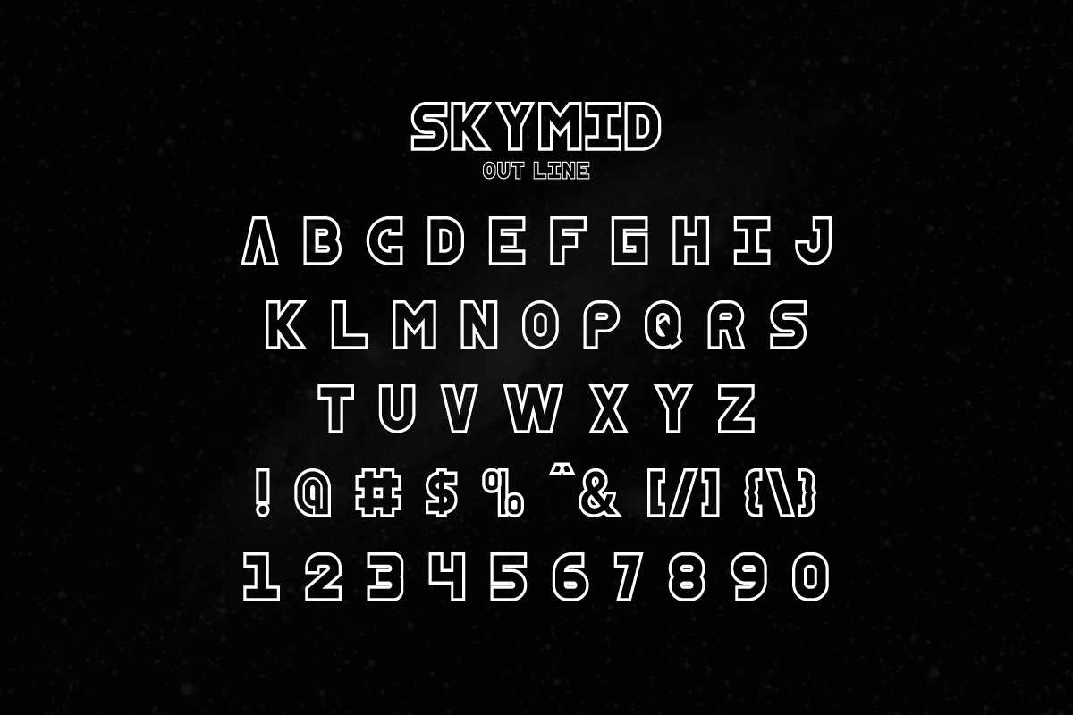 SkyMid is a modern sans serif display font with unique style characters. It has a unique style that will bring the special effect to the design. It will works for games, technology, events, spaceship and any modern things. SkyMid Font includes full set of Uppercase and Lowercase Basic Characters, Numerals and Punctuation. The font is perfect for many projects, headlines, logos, poster, tittle, products, etc. It has two styles : Regular and Outline.
