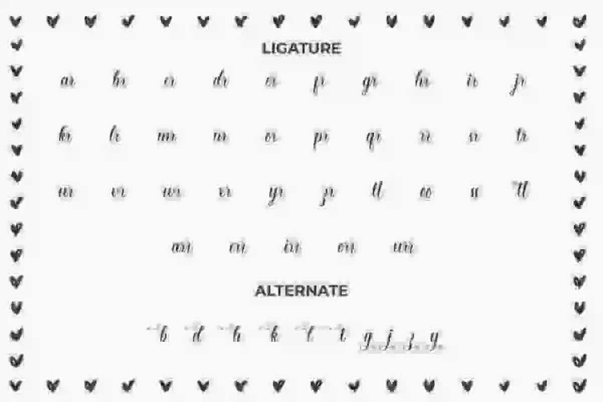 Soraya Lovely Font includes full set of Uppercase and Lowercase Basic Characters, Numerals, and Punctuation. It also contain ligature and alternate characters that will add perfection and making it suitable for many industries, such as boutique, café, cosmetic, fashion, florist, jewelry, photography, spa salon, wedding or event organizer, etc.