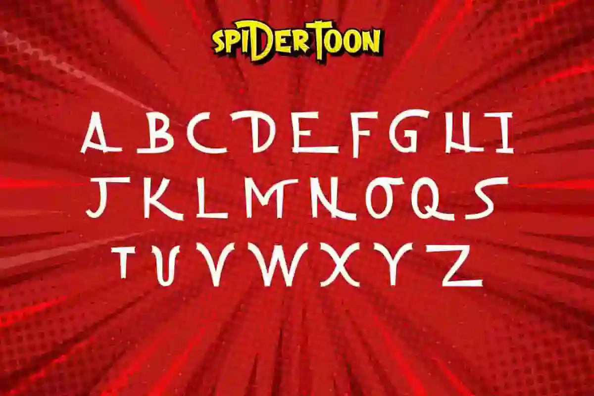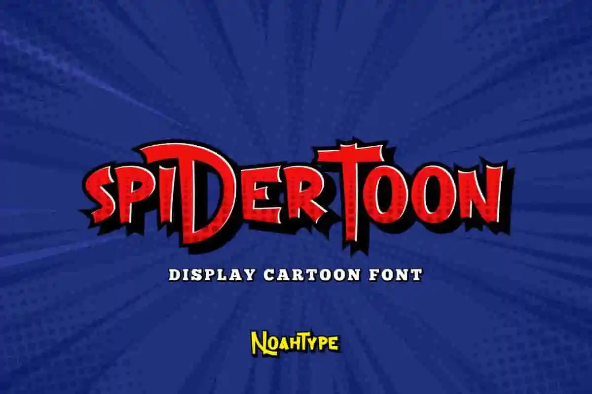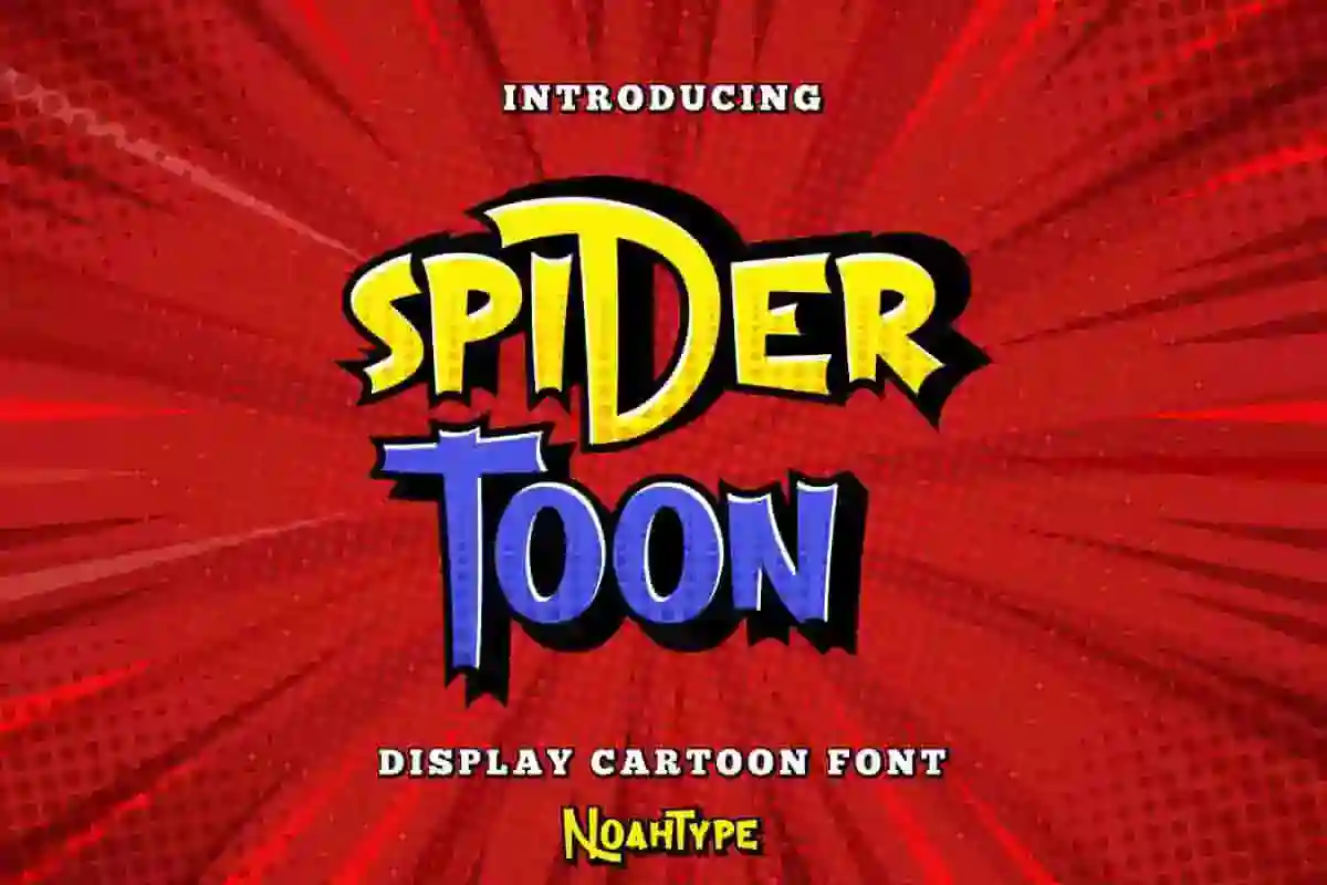 Spider Toon Font is a playful display font with cartoon style created by NoahType. The comic inspired font characters bring energic vibe while easily to read and make it easier for your work in any situation. It will be amazing for project like: apparel printing design, branding, comic design, custom mug, creating logo, headline, kid stuff, poster, product packaging, quote, and more.