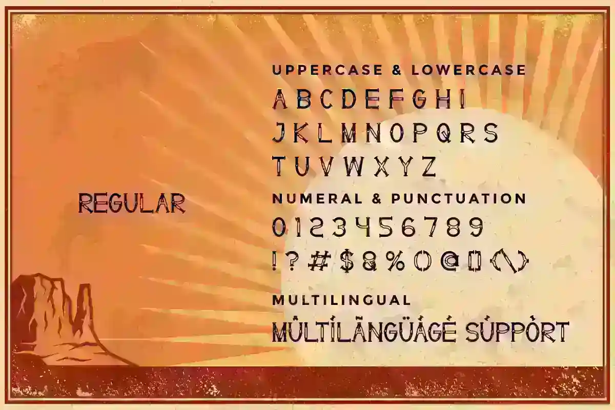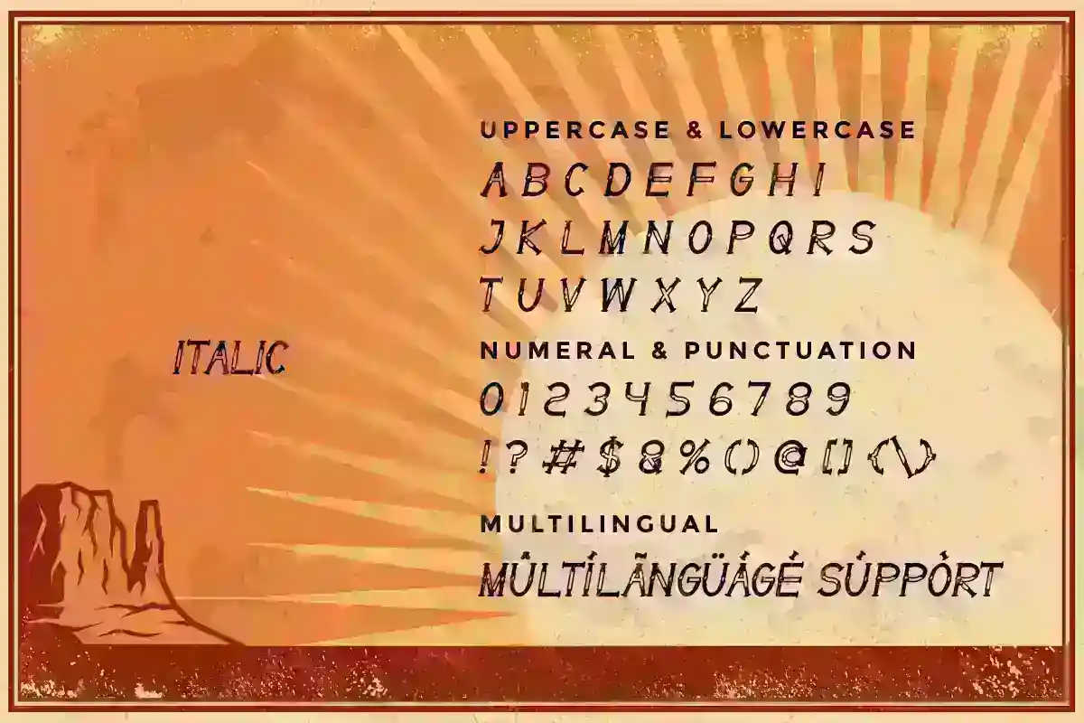 The Western Font has two styles : Reguler and Italic. It includes full set of Uppercase and Lowercase Basic Characters, Numerals and Punctuation, also it contains ligatures to make it awesome. You can also combine the two styles on the text like we did on the cover, so you will great even more unique and special font. The font is perfect for many projects, headlines, logos, poster, tittle, products, etc